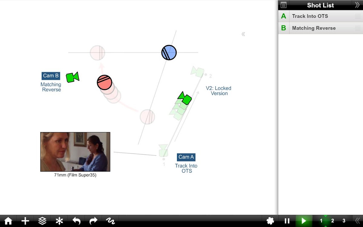 Shot Designer — это БЫСТРО. Приложение знает, как работает Directing, и автоматически выполняет большую часть работы за вас. Камеры перестраиваются при перемещении персонажей. Анимируйте персонажей и камеры с помощью простых команд Walk To и Track To. Создавайте сложные трекинговые снимки с несколькими отметками. Shot Designer достаточно быстр, чтобы вы могли изменить схему, ожидая актеров.