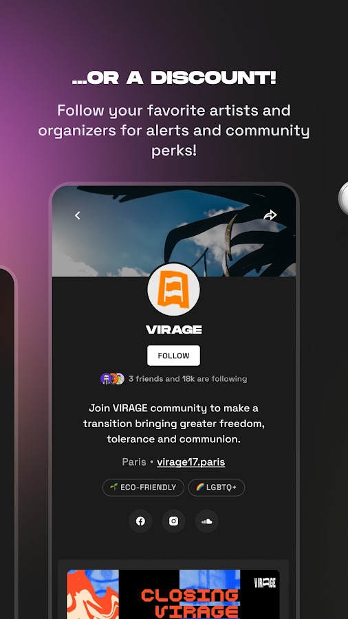 — Специально для вас: получайте персонализированные оповещения, синхронизируясь с музыкальными сервисами и подписываясь на любимых исполнителей или организаторов.