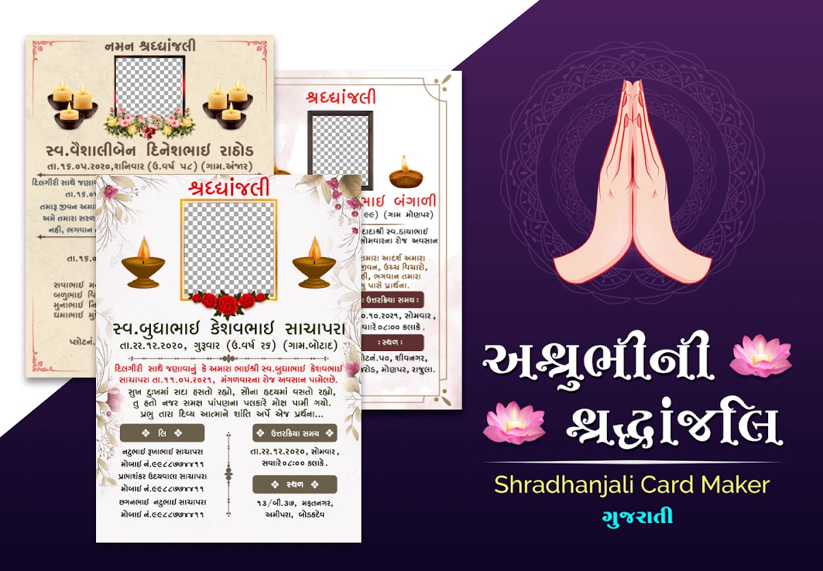 В этом цифровом мире с помощью смартфона создайте श्रद्धांजलि Карту, не посещая ни одну фотостудию. Это приложение для создания цифровых карт Shradhanjali также известно как приложение для создания электронных карт для соболезнований, дани, кончины, Besnu (બેસણુ), शोकसभा, Bhavpurna Shradhanjali Banner (भावपूर्ण श्रद्धांजली बॅनर), भावपूर्ण श्रद्धांजलि फोटो फ्रेम, Shok Sandesh Card Maker (शोक संदेश कार्ड) मेकर), фоторамка смерти, фоторамка Пунятити, фоторамка годовщины смерти, фоторамка RIP, тусовка на поминальной службе.