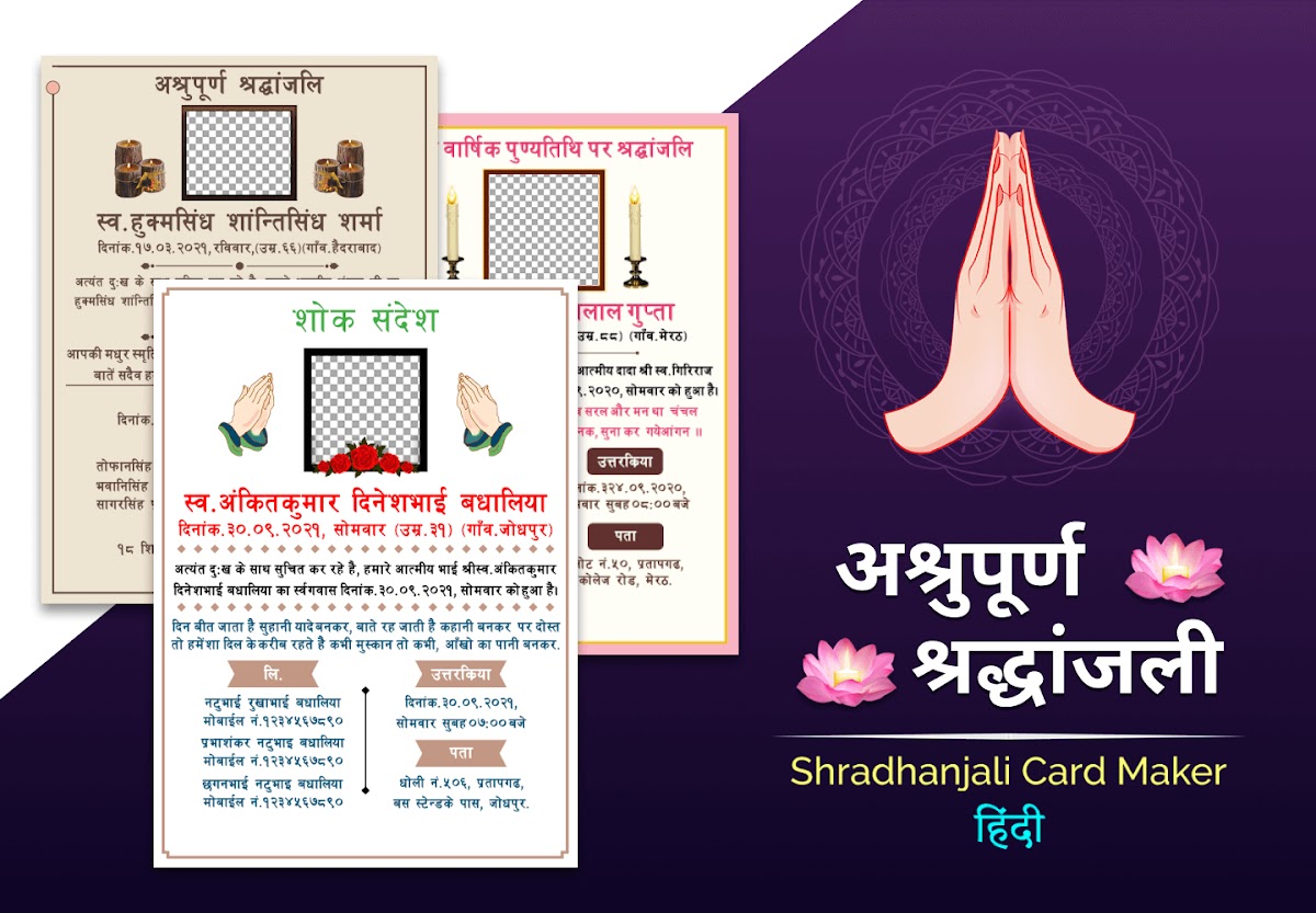 શ્રદ્ધાંજલિ Card Maker помогает быстро и легко создавать открытки с соболезнованиями в связи с кончиной человека вместе с शोकसभा, श्रद्धांजली बॅनर, श्रद्धांजलि फोटो फ्रेम, शोक संदेश कार्ड.