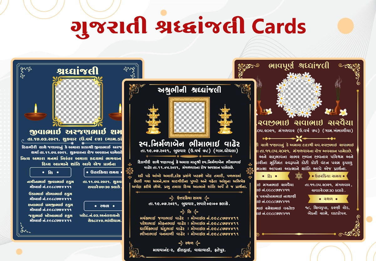 Создайте похоронную цифровую карту за несколько секунд и несколько шагов. Приложение дает огромную коллекцию карт Шрадханджали, Бесну, Шоксабха, Панидхол и многих других.