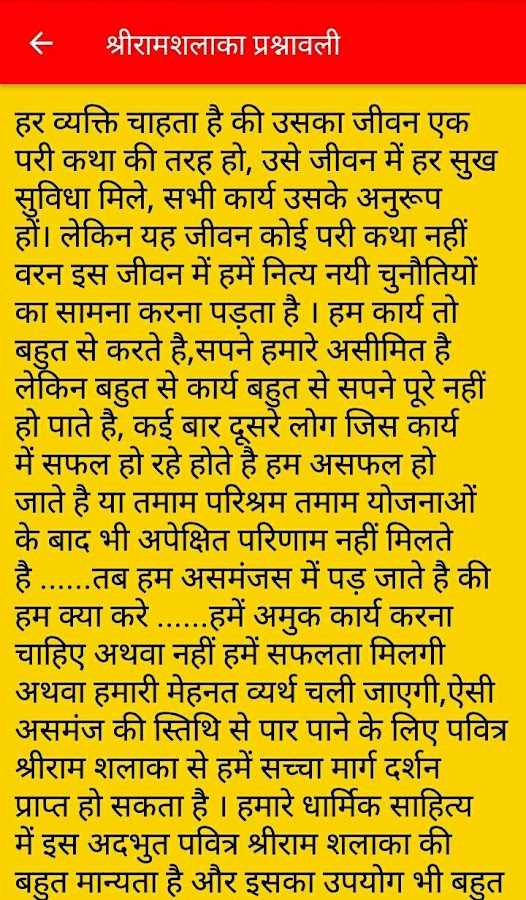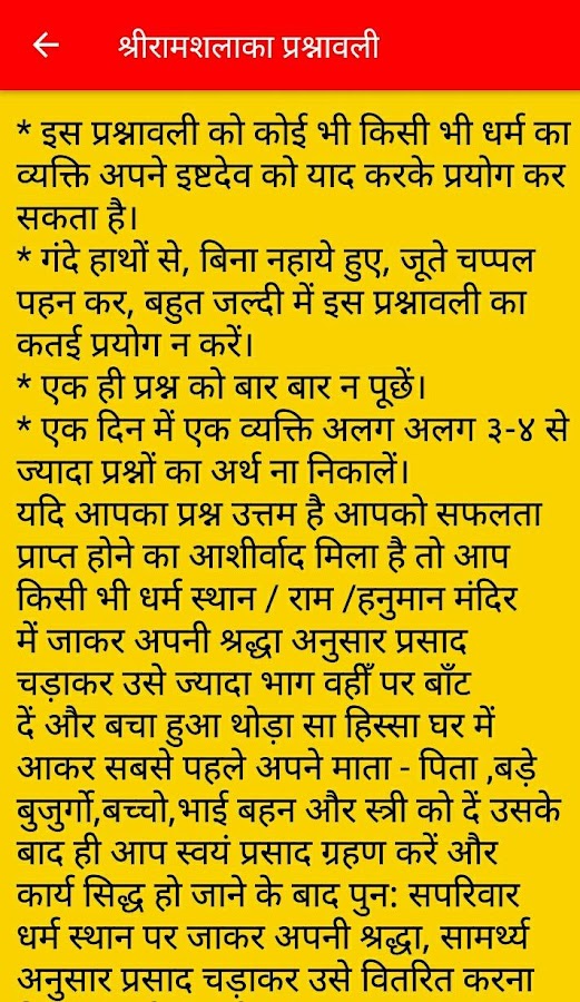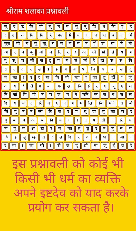 Рам шалака prashnavali (श्रीराम शलाका प्रश्नावली) приложение, которое может сказать ваше будущее. Рам-шалака была создана Тулсидасом. Это приложение можно использовать, чтобы получить ответы на все ваши вопросы, которые вы не можете решить. Это расскажет о вашем будущем, как пророк или оракул, и вы получите ответы на большинство своих вопросов.