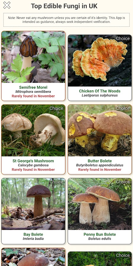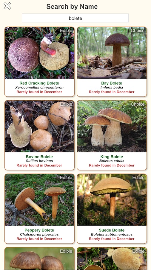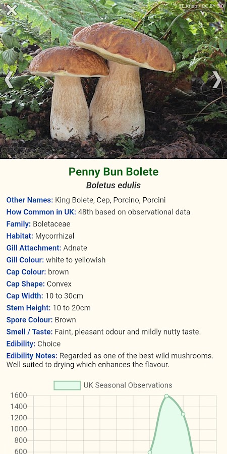 Для пользователей европейского приложения вы обнаружите, что каждый из перечисленных грибов имеет перекрестную ссылку с номером страницы, на котором он указан в популярной книге «Грибы — Роджер Филлипс».