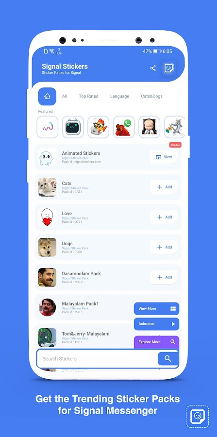 Signal Stickers — это приложение для установки наклеек в ваше приложение Signal. Приложение состоит из списка наклеек на основе различных категорий с простым и легким в использовании макетом дизайна пользовательского интерфейса.