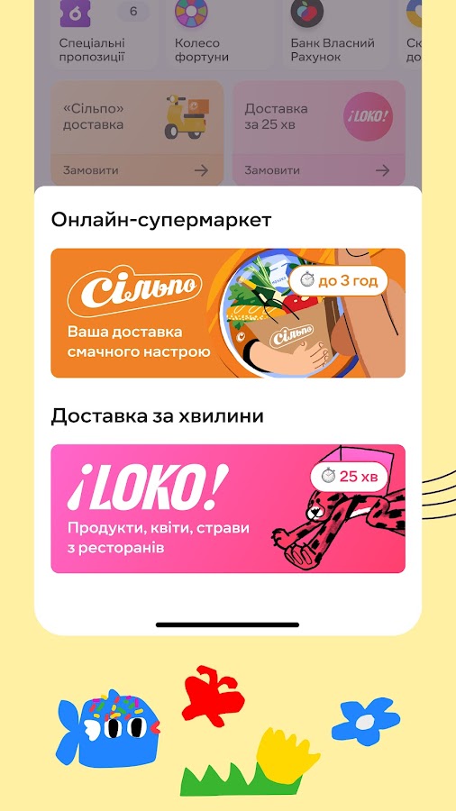 🚴♂️LOKO – ДОСТАВКА ЗА ХВИЛИНИУ застосунку доступна онлайн доставка товарів через доставку «Сільпо» або LOKO. Інтернет магазин продуктів доставляє продукти, фрукти, свіжі овочі, гігієнічні товари, зоотовари. Також доступне замовлення їжі зі стравами з ресторанів.