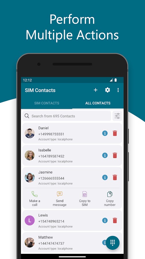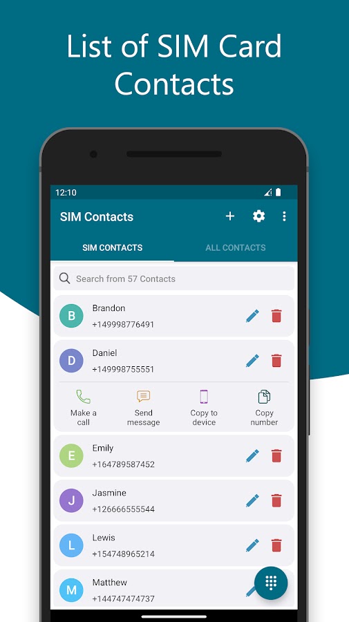 Приложение содержит список контактов SIM-карты и позволяет выполнять такие действия, как вызов, отправка SMS, редактирование, удаление и копирование на устройство.