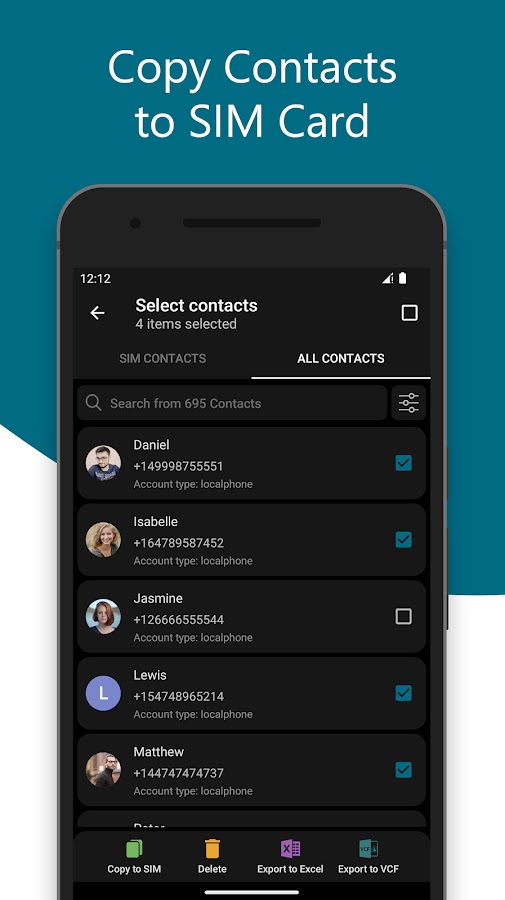 Вы можете экспортировать контакты SIM-карты и устройства в таблицу Excel или файл VCF.