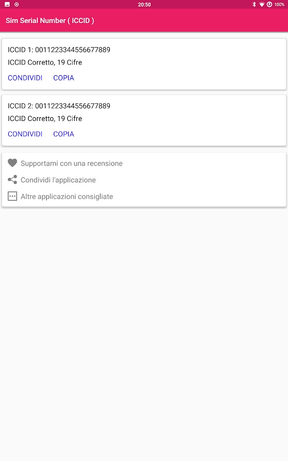 Серийный номер сима, простое приложение для чтения кода ICCID, который обычно пишется на обратной стороне сима, часто случается, что он обрезан (например, для перехода на микросим) или по той или иной причине больше не читается, а вот и серийный номер сима, приложение, которое позволяет вам считывать код с вашего сима, даже не снимая его с телефона, одним щелчком мыши, а если вам нужно сообщить его кому-то, удобные «поделиться» и « копия» подходят именно вам!