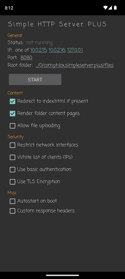 Представляем «Простой HTTP-сервер» для Android — ваш незаменимый инструмент для экспериментов, создания прототипов и простого обмена файлами между устройствами. Разместите локальный HTTP-сервер со статическим контентом без особых усилий. Доступно на телефонах, планшетах и Android TV. Легко обменивайтесь файлами и прототипами решений. Наслаждайтесь интуитивно понятными функциями управления файлами, такими как загрузка через веб-интерфейс и базовое редактирование файлов (*в версии «PLUS»). Оптимизируйте свои проекты с помощью «Простого HTTP-сервера» уже сегодня.