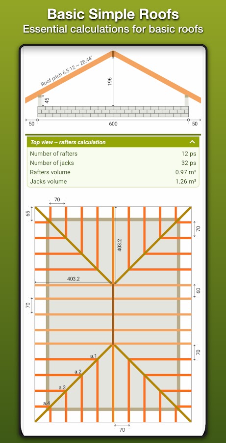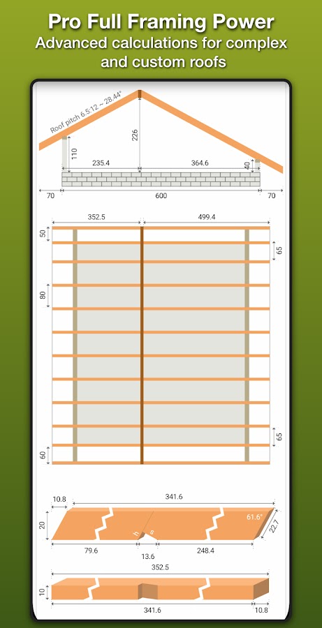 ✅ Комплексные расчеты каркаса: Мгновенно рассчитывайте длины вальмовых, ендовых, промежуточных и обычных стропил, а также точный уклон и углы среза.