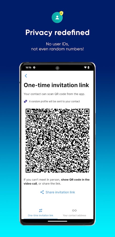 — полная защита от спама и злоупотреблений: поскольку у вас нет идентификатора на платформе SimpleX, с вами нельзя будет связаться, если вы не поделитесь одноразовой ссылкой-приглашением или необязательным временным адресом пользователя.