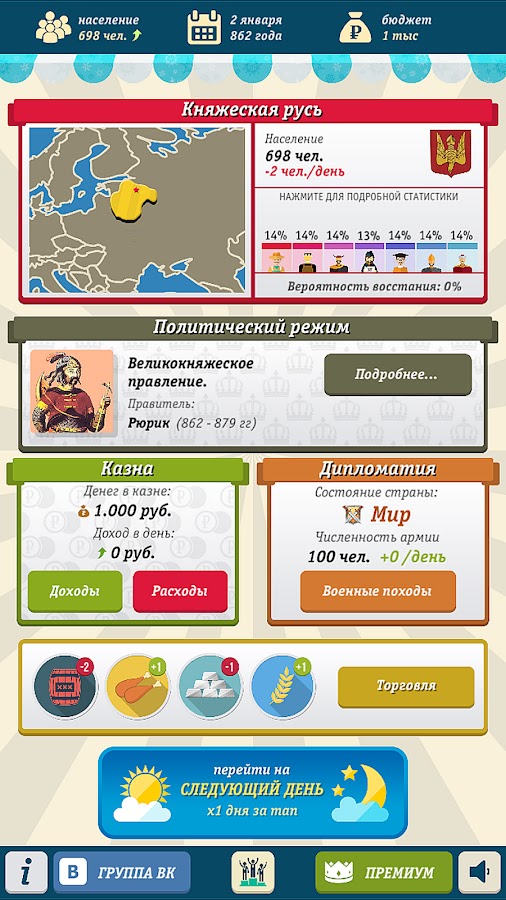Вы так же можете торговать с соседними странами, покупать необходимые ресурсы или продавать лишние. Ну а если начнутся проблемы соседями, то всегда можно на них напасть и решить вопрос силой!
