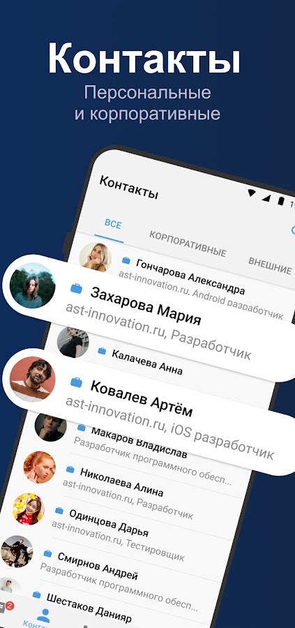 — Синхронизация с организационной структурой компании, визуализация ФИО, должности и контактной информации о пользователе