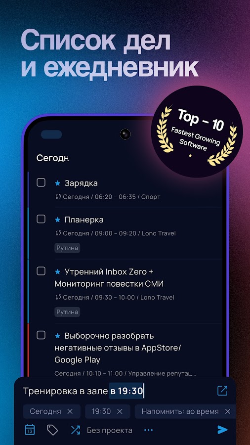 Распознавание даты и времени поставит напоминалку в календарь задач, даже если вы диктуете задачу голосом. До пяти напоминаний у каждой задачи в планировщике дел. Для важных дел включите режим будильника, чтобы напоминалка помогла их не пропустить.