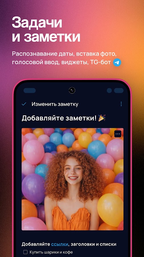 Голосовой ввод, виджеты, удобный интерфейс, telegram-бот и создание задач по email. Отправляйте дела, заметки, идеи в список задач сразу, чтобы не держать их в голове.