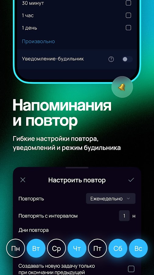 Гибкие настройки повторов для регулярных напоминаний помогут выгрузить рутину из головы в календарь, повышая продуктивность. Используйте повтор для планирования дня, напоминания о днях рождения, тренировках, учебе и работе.