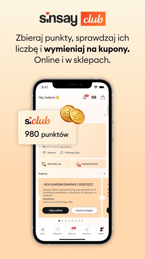 👗Программа лояльности Sinsay Club! Присоединяйтесь и наслаждайтесь уникальными преимуществами! За каждую покупку вы накапливаете баллы, которые можете обменять на купоны на сумму до -50 злотых. Станьте нашим постоянным клиентом и воспользуйтесь выгодными предложениями только для Членов Клуба.