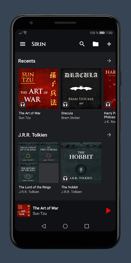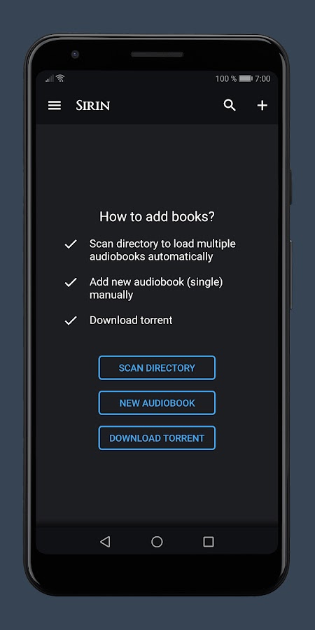 Сирин — плеер для аудиокниг. Приложение позволяет Вам слушать аудиокниги бесплатно во множестве форматов (mp3, m4b, flac, ogg, opus, wma, wv и другие) и скачать аудиокниги используя торрент файл или magnet-ссылку. Оно автоматически анализирует метаданные(теги) аудио файлов (включая главы и обложки книг) и помогает вам управлять библиотекой.