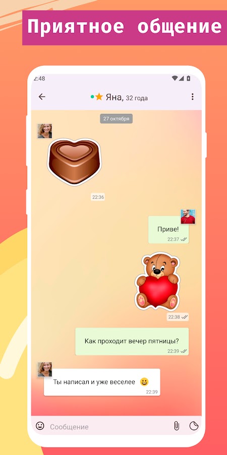 Ваш круг общения ограничен коллегами по работе и старыми друзьями? Хватит тратить время впустую и пассивно ждать любовь, прозябая в одиночестве, нужно скачать приложение знакомств Sitelove и заполнить анкету. Завязать общение с понравившимся парнем или девушкой, узнавать друг друга в процессе диалога и договариваться о свидании в реальной жизни.