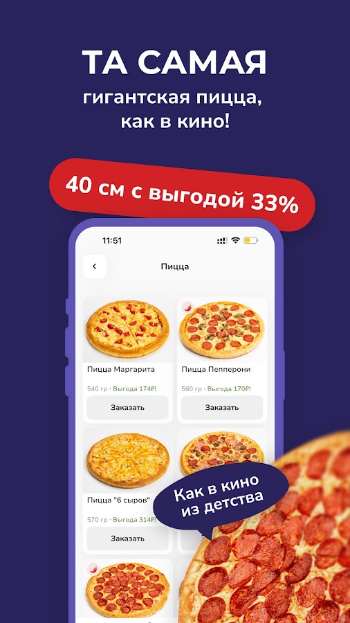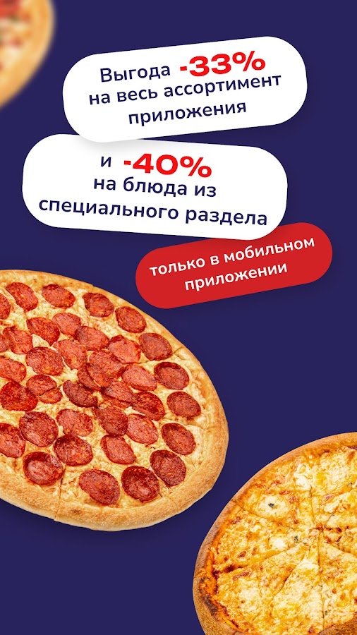 Заказывайте любые пиццы, комбо, закуски, и другую еду в мобильном приложении со скидкой 33%.