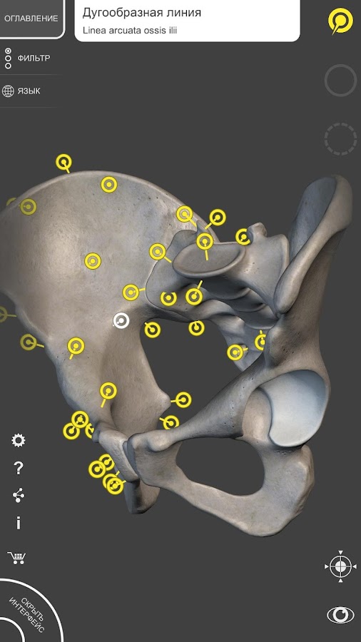 При выборе моделей или значков вам будут показаны термины, относящиеся к любой специфической анатомической части, вы можете выбрать из 12 языков и показ терминов на двух языках одновременно.
