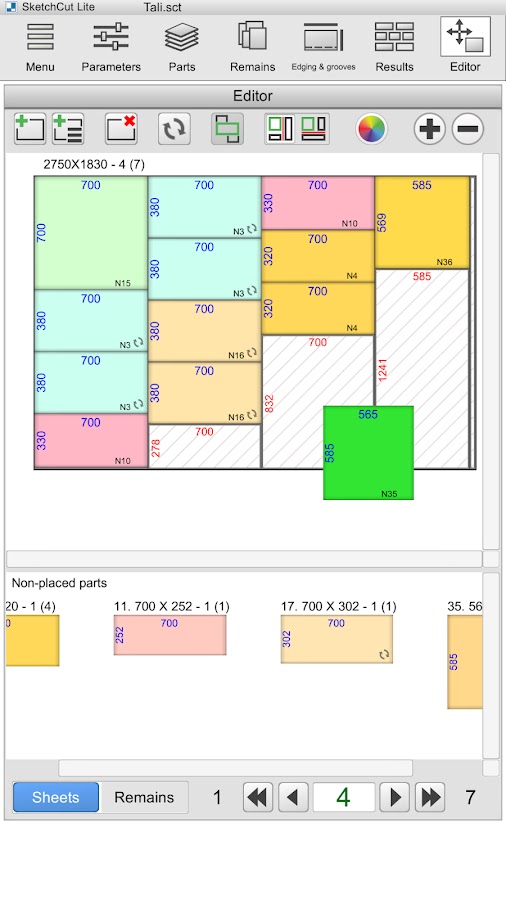 • Редактор карт раскроя – используйте Редактор, чтобы разложить детали вручную или подправить раскрой
