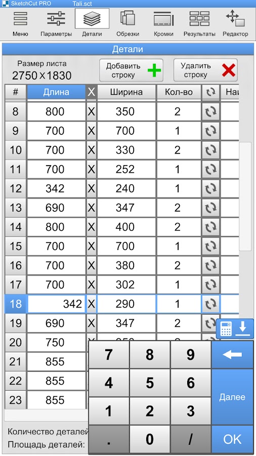 • Ввод размеров деталей и остатков в таблицу – как в Excel