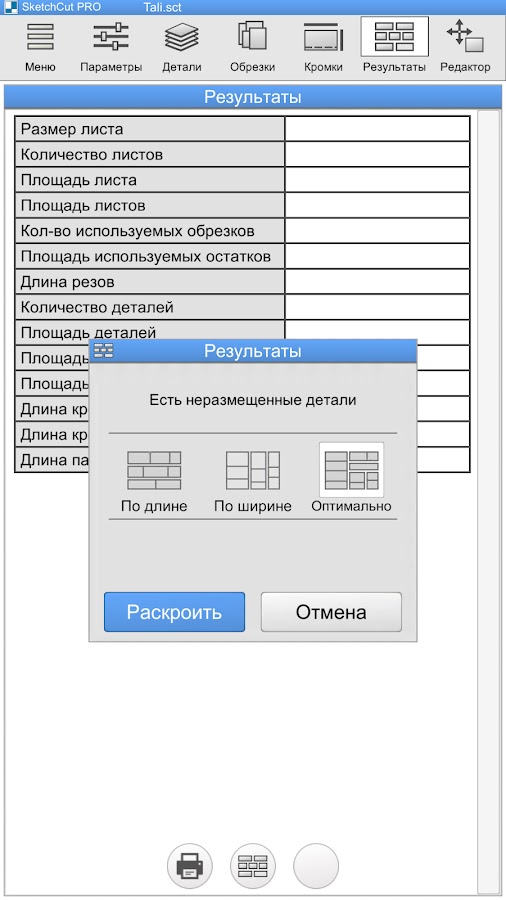 Приложение разработано с учетом особенностей раскроя материалов в листах (ДСП, МДФ, стекло, пластики, мебельный щит и т.д.) как вручную, так и на станках.