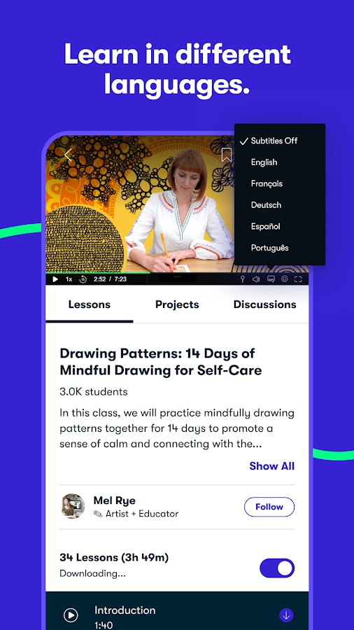 Присоединяйтесь к нашему сообществу из 7 миллионов людей, которые никогда не прекращают учиться, узнайте о стилях и стратегиях, которые должны знать современные творческие люди. Вас ждут более 25 000 онлайн-уроков в таких увлекательных творческих областях, как акварель, каллиграфия, фотография, графический дизайн, иллюстрация, рукописные надписи, дизайн значков и дизайн рисунков. Вы также можете углубить свои знания на уроках по маркетингу в социальных сетях, бухгалтерскому учету, повышению эффективности и многим другим дисциплинам,