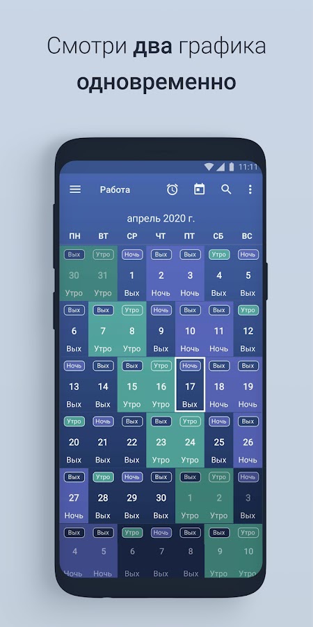 На рабочем календаре можно просматривать два графика одновременно, а сохранять до восьми графиков, если нужно отслеживать несколько работ или рабочие смены коллег, друзей или родственников.