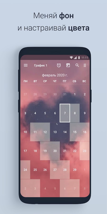 В графике можно настраивать цвета рабочих смен, переименовывать смены по необходимости, так же можно поменять фон календаря.