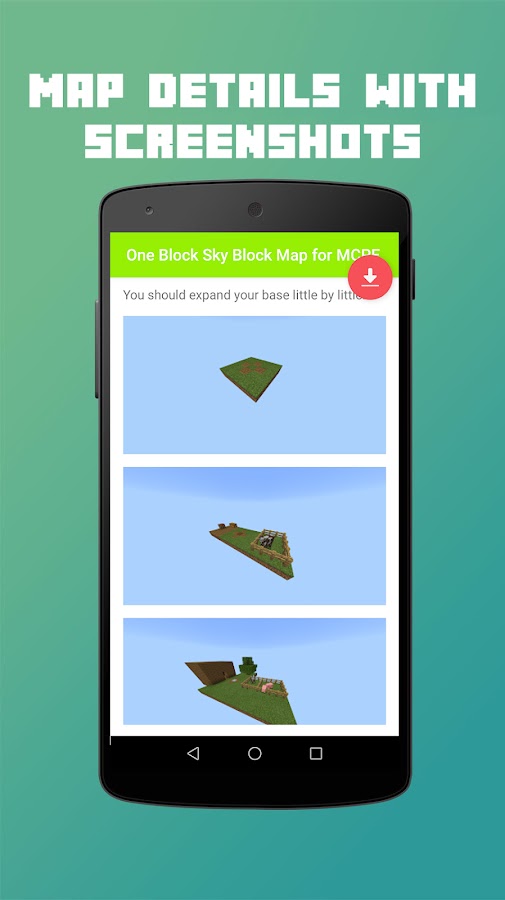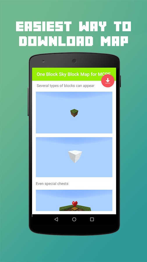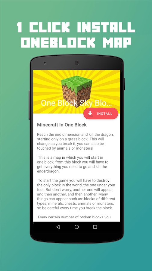 One Block Sky Block Map для MCPE — это приложение, которое позволило вам загрузить и установить полнофункциональную карту One Block для Minecraft Pocket Edition всего за несколько простых шагов! С помощью нашего установщика в 1 клик вы можете легко загрузить карты, дополнения, моды, скины и текстурные пакеты Minecraft на свой смартфон или планшет всего одним нажатием!