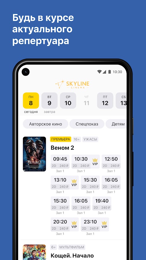 Узнавайте расписание сеансов в кинотеатрах сети «Скайлайн Синема». достаточно удобного времени и указаний для просмотра фильма, не выходя из приложения.