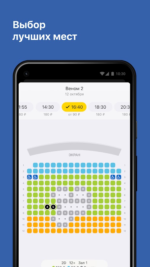 В нашем приложении приведена схема зала с цветовой индикацией стоимости мест, чтобы вы могли выбрать подходящее для вас положение для просмотра.