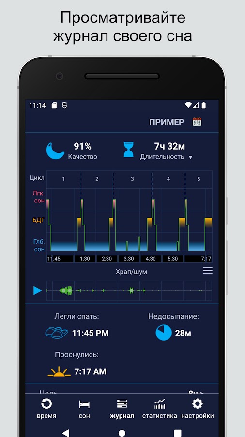 Если вы хотите определить свои реальные циклы сна — наша функция отслеживания сна позволяет отслеживать и анализировать ваш сон, и если все сделано правильно, покажет вам прогресс сна — когда вы находились в легкой, глубокой фазе или фазе быстрого сна (она же фаза сновидений) и ваши циклы сна. Также можно включить обнаружение храпа/шума.