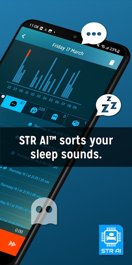 Sleep Talk Recorder отслеживает ваш сон, но это не просто постоянная запись. Расширенная функция фильтрации квалифицирует звуки и запускает технологию Sleep Talk Recorder за миллисекунду. Утром STR AI™ рассортировал ваши звуки по категориям для вашего удобства.