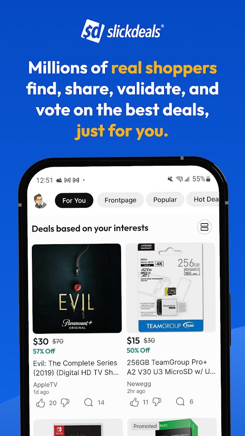 • Slickdeals стремится предложить исчерпывающий охват самых популярных торговых предложений, скидок, купонов, промо-кодов и рекламных акций для тысяч различных магазинов, таких как Amazon, Best Buy, Target и других. У нас есть специальная команда, которая работает круглосуточно, чтобы искать, публиковать и проверять предложения, которые мы представляем потребителям.