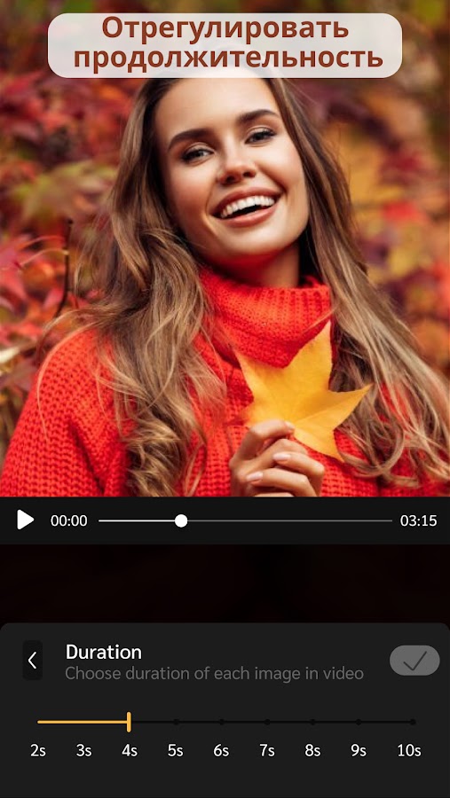 ✔ Отрегулируйте длину видео по своему усмотрению, изменив время слайд-шоу между изображениями.