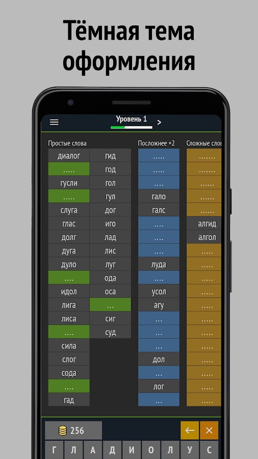 Введенные слова автоматически проверяются и добавляются к списку отгаданных. Все слова из слова разделены по сложности на 3 категории: