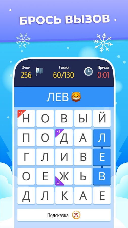 Каждый поединок с соперником состоит из 3-х раундов. Каждый раунд длится 2 минуты. Твоя цель — составлять из букв слова, и набрать наибольшее количество очков. Но это не так просто, как может показаться! Слова могут быть любой части речи, а бонусные буквы на игровом поле дают прирост очков.