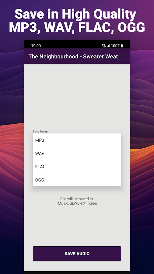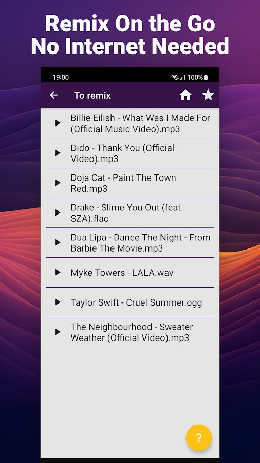 Просто откройте аудиофайлы из папки «Музыка». Были ли они скопированы с компакт-диска, романтического микстейпа или куплены у исполнителя. Приложение работает в автономном режиме и поддерживает множество форматов: MP3, WAV, FLAC, OGG. Используйте их все для создания лофи-ремиксов с замедлением и реверберацией!