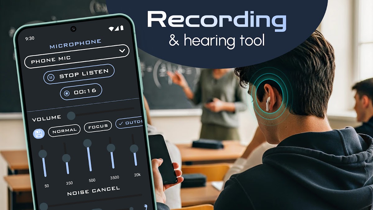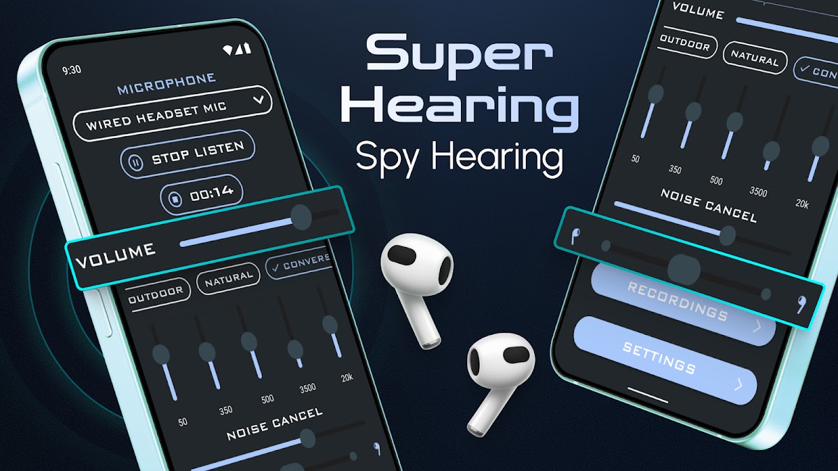 Listen from Distance помогает лучше слышать разговоры. Полезно для людей с нарушениями слуха и тех, кому нужно слышать издалека, Listen from Distance может усиливать звуки окружающей среды, разговоры, голос учителя во время лекции или звук телевизора, чтобы слышать громче на расстоянии. Listen from Distance может усиливать звуки вокруг вас или из вашей окружающей среды для сверхчувствительного слуха на расстоянии. Используйте Super Hearing from Distance с проводными или Bluetooth-наушниками, чтобы фильтровать, усиливать и увеличивать звуки в вашем окружении для сверхчувствительного слуха.