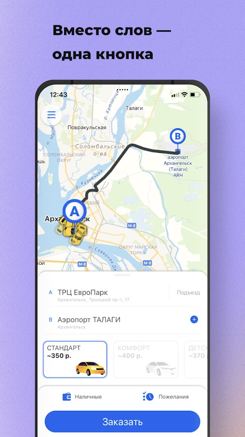 Заказывайте РУССКОЕ ТАКСИ в городе Архангельск через приложение. Это в 3 раза быстрее, чем по телефону! Между желанием доехать до нужного места и поиском автомобиля — пара секунд.