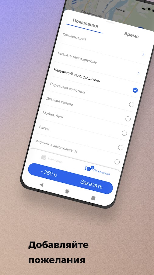 Добавьте к заказу дополнительные пожелания. Например, когда едете с ребенком — выберите «детское кресло». Если вы не переносите запах табака — укажите «Некурящий салон», и к вам приедет некурящий водитель.