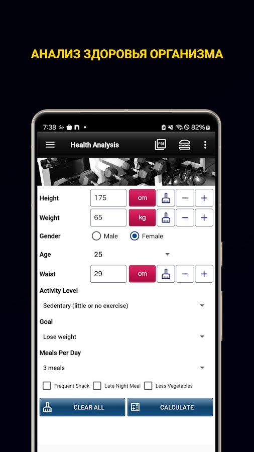 Комплексный анализ информации о здоровье на основе данных о росте, весе и окружности талии. Предоставляет данные об индексе массы тела (ИМТ), идеальном весе, процентном содержании жира в организме, скорости основного обмена веществ, рекомендуемом количестве калорий и потреблении воды.