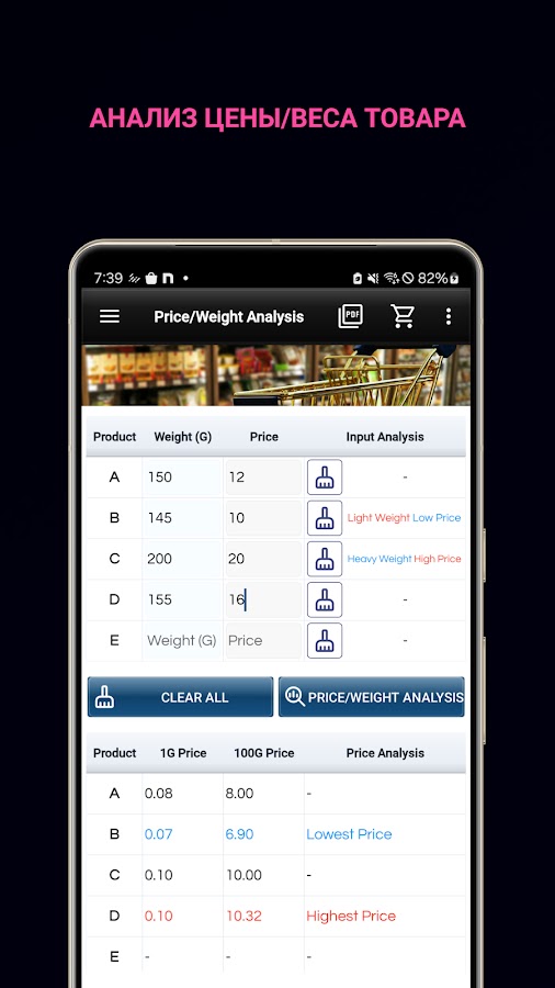 Анализ цены/веса: сравнивает цены за 1 г и 100 г.