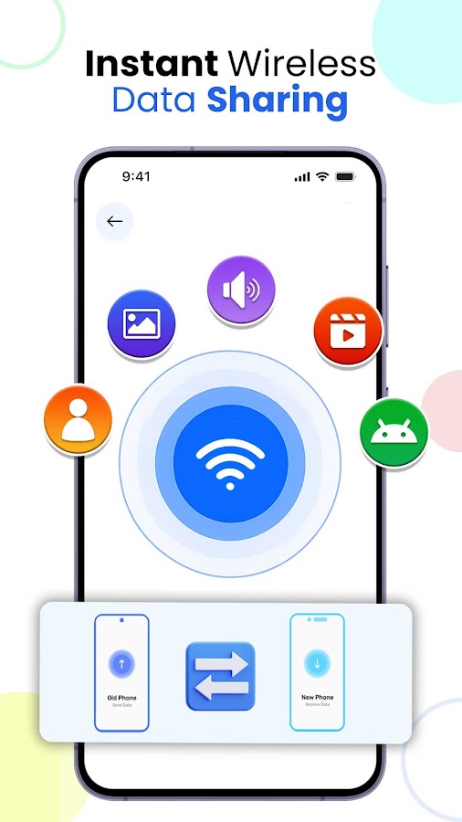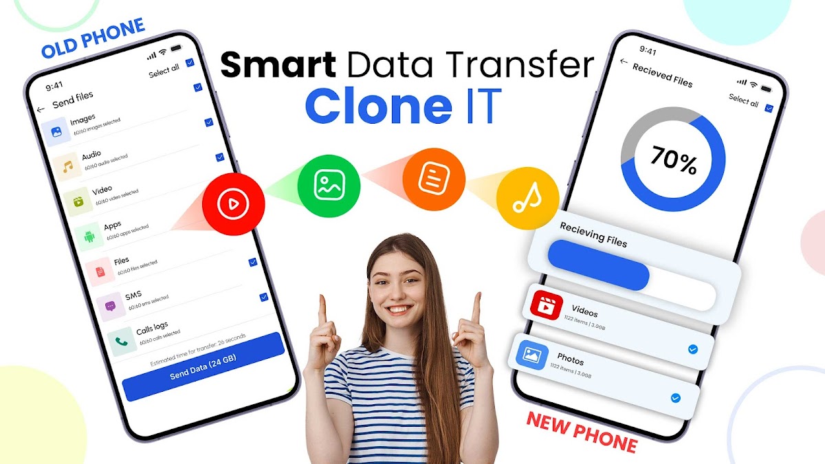 Передача данных является абсолютной проблемой для любого пользователя, который хочет перенести данные с Android на Android или перенести данные со старого телефона на новый. Но уже не так: вы можете просто получить приложение «умный коммутатор», которое сделает все очень просто и без проблем доставляет данные с Android на Android. Наше приложение для клонирования телефонов использует новейшие свойства Android для интеллектуальной передачи данных или обмена файлами с непревзойденной скоростью, безопасностью и надежностью. С помощью этой интеллектуальной передачи данных, вы можете потерять некоторые ненужные вещи в вашем старом телефоне и обмениваться файлами, которые необходимы в новом телефоне Android.