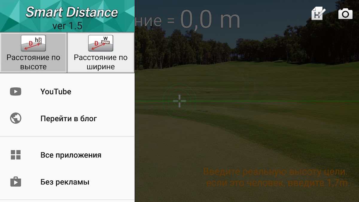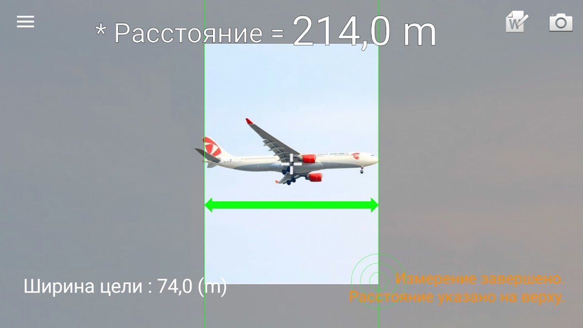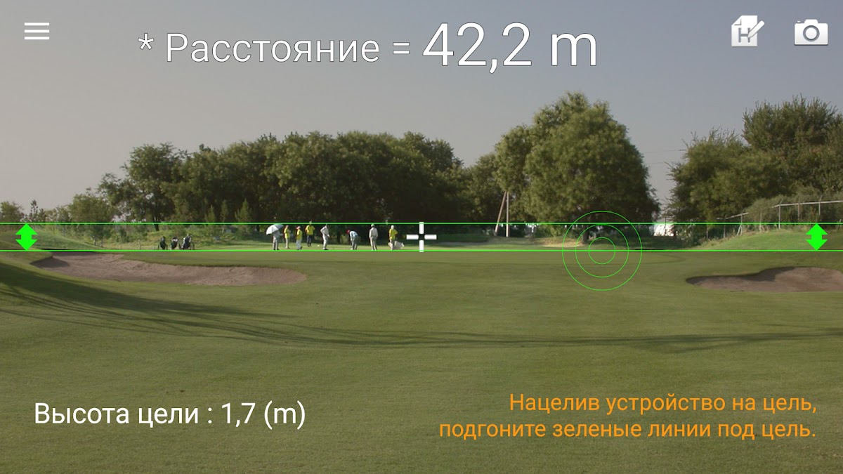 Пользоваться инструментом очень просто. Введите высоту (ширину) цели и нажмите на экран. Когда цель выравнена по двум зелёным линиям, вы получите измеренное расстояние.