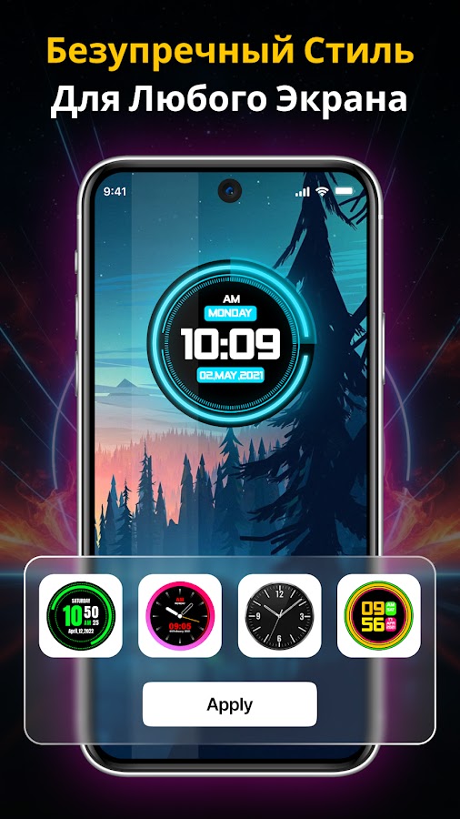 Дисплей Получите футуристические и современные неоновые цифровые часы, которые улучшат ваше устройство яркими, светящимися цифрами и плавной анимацией. Эти постоянно включенные часы идеально подходят для ночного режима, прикроватных часов и домашних экранов. Переключайтесь между цифровыми и аналоговыми часами, настраивайте цвета и устанавливайте динамические фоны, соответствующие вашей эстетике.