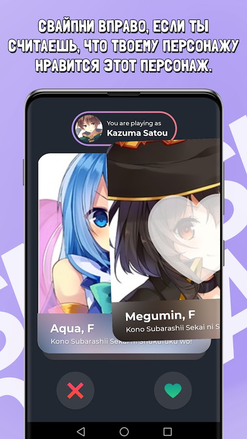 Свайпай персонажа вправо, если считаешь, что выбранный тобой персонаж хотел бы встречаться с ним. Свайпай влево, если нет.
